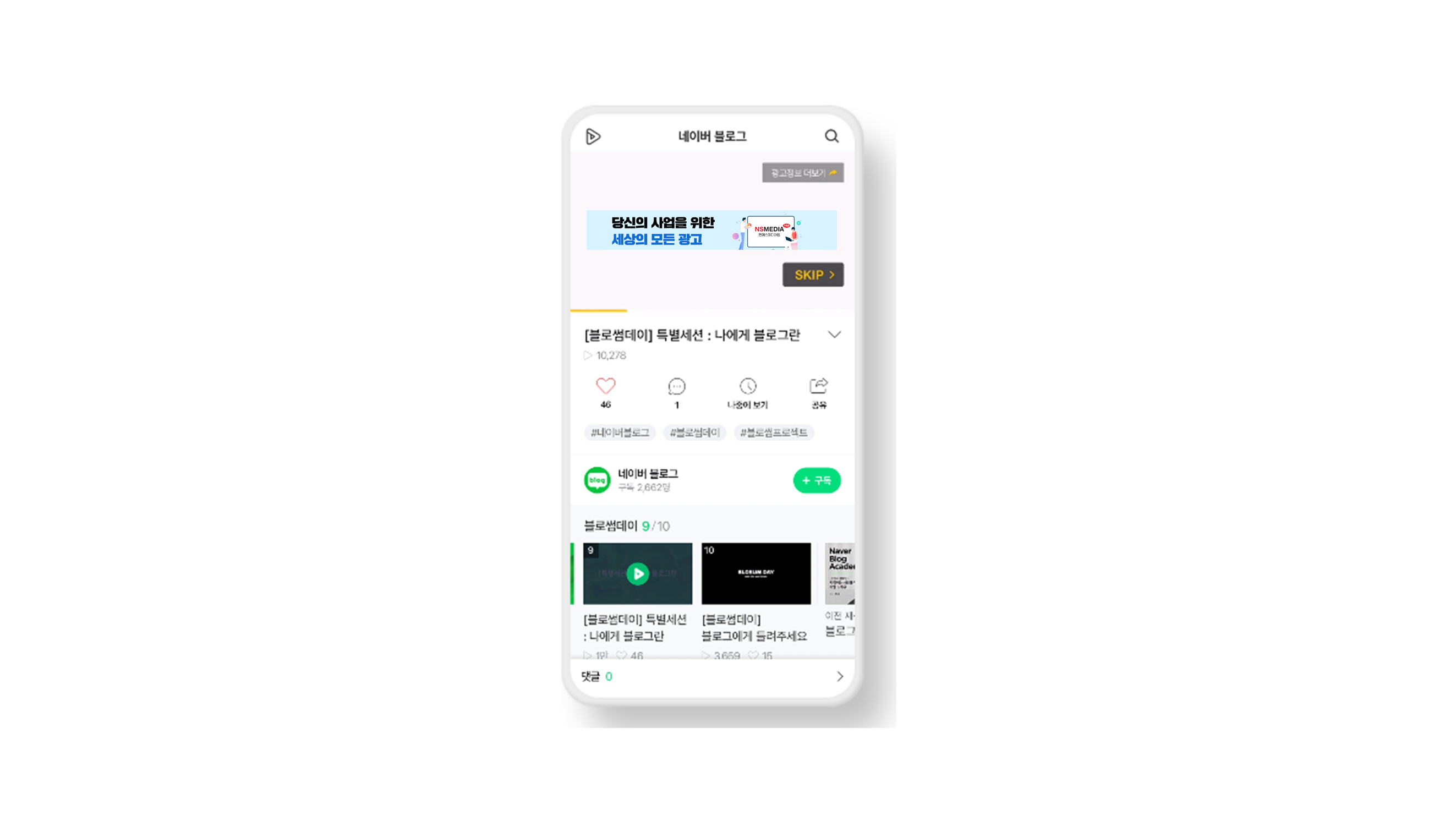 노출되어 높은 브랜드 인지 효과를 기대할 수 있습니다. 5초 후 SKIP 기능이 있어 이용자가 시청 여부를 선